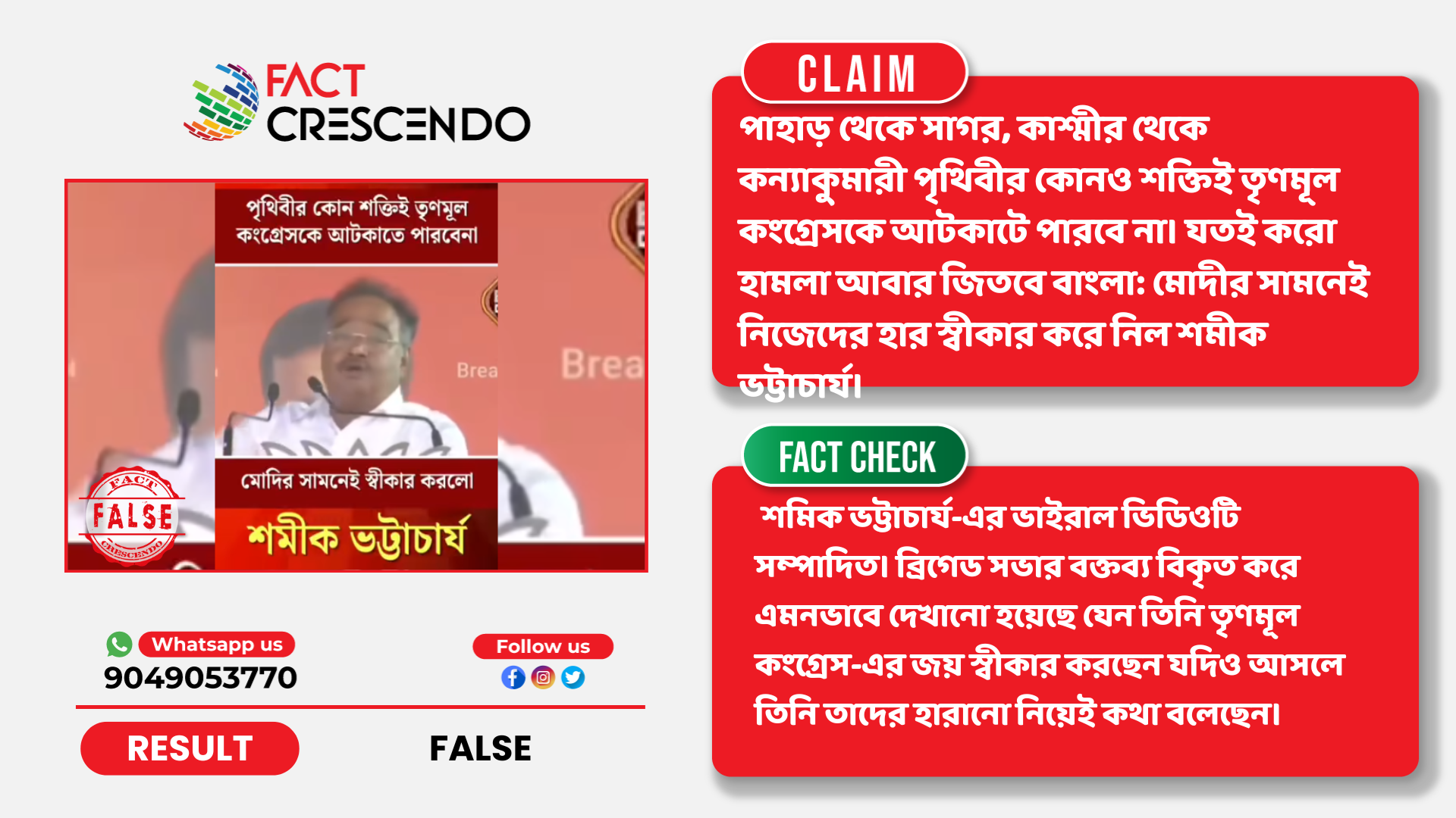 নিষ্কর্ষঃ তথ্য যাচাইয়ের মাধ্যমে ফ্যাক্ট ক্রিসেণ্ডো এই সিদ্ধান্তে উপনীত হয়েছে যে, শমিক ভট্টাচার্য-এর ভাইরাল ভিডিওটি সম্পাদিত। ব্রিগেড সভার বক্তব্য বিকৃত করে এমনভাবে দেখানো হয়েছে যেন তিনি তৃণমূল কংগ্রেস-এর জয় স্বীকার করছেন যদিও আসলে তিনি তাদের হারানো নিয়েই কথা বলেছেন।