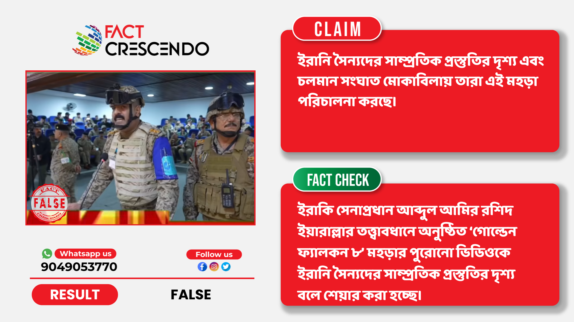 নিষ্কর্ষঃ তথ্য যাচাইয়ের মাধ্যমে ফ্যাক্ট ক্রিসেণ্ডো এই সিদ্ধান্তে উপনীত হয়েছে যে, ইরাকি সেনাপ্রধান আব্দুল আমির রশিদ ইয়ারাল্লার তত্ত্বাবধানে অনুষ্ঠিত ‘গোল্ডেন ফ্যালকন ৮’ মহড়ার পুরোনো ভিডিওকে ইরানি সৈন্যদের সাম্প্রতিক প্রস্তুতির দৃশ্য বলে শেয়ার করা হচ্ছে।