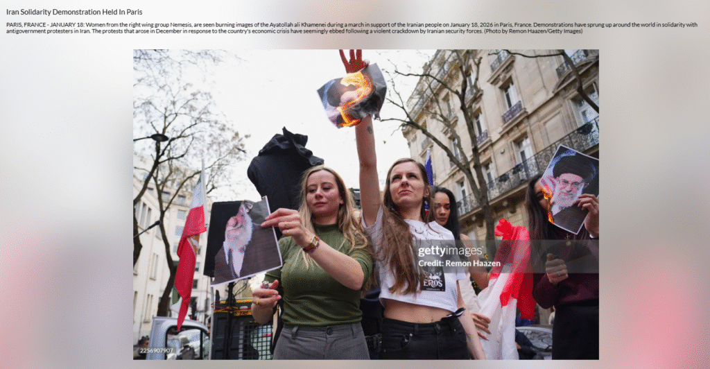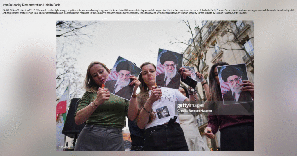 স্টক ইমেজ সংস্থা গেট্টি ইমেজ’-এর গ্যালারিতেও এই প্রদর্শনের বেশ অনেকগুল ছবি পাওয়া যায়। সংশ্লিষ্ট ভাইরাল ভিডিওর সাথে মিল থাকার একটি ছবির সাথে লেখা হয়েছে,”ডানপন্থী সংগঠন নেমেসিস–এর নারীদের ইরানের জনগণের সমর্থনে একটি মিছিলে আয়াতুল্লাহ আলি খামেনির ছবিতে আগুন দিতে দেখা যায়। ঘটনাটি ১৮ জানুয়ারি ২০২৬, ফ্রান্সের প্যারিসে। ইরানে সরকারবিরোধী বিক্ষোভকারীদের প্রতি সংহতি জানিয়ে বিশ্বের বিভিন্ন জায়গায় প্রতিবাদ হয়েছে। দেশটির অর্থনৈতিক সংকটের কারণে ডিসেম্বর মাসে যে বিক্ষোভ শুরু হয়েছিল, তা ইরানি নিরাপত্তা বাহিনীর কঠোর দমন-পীড়নের পর কমে গেছে।“