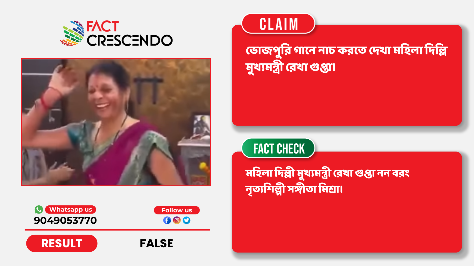 তথ্য যাচাইয়ের মাধ্যমে আমরা পেয়েছি দাবিটি মিথ্যা। ভিডিওর মহিলা রেখা গুপ্তা নয় বরং তার নাম সঙ্গীতা মিশ্রা। সঙ্গীতা একজন নৃত্যশিল্পী যিনি নিজেকে একজন নৃত্য উত্সাহী হিসেবে বর্ণনা করেন।