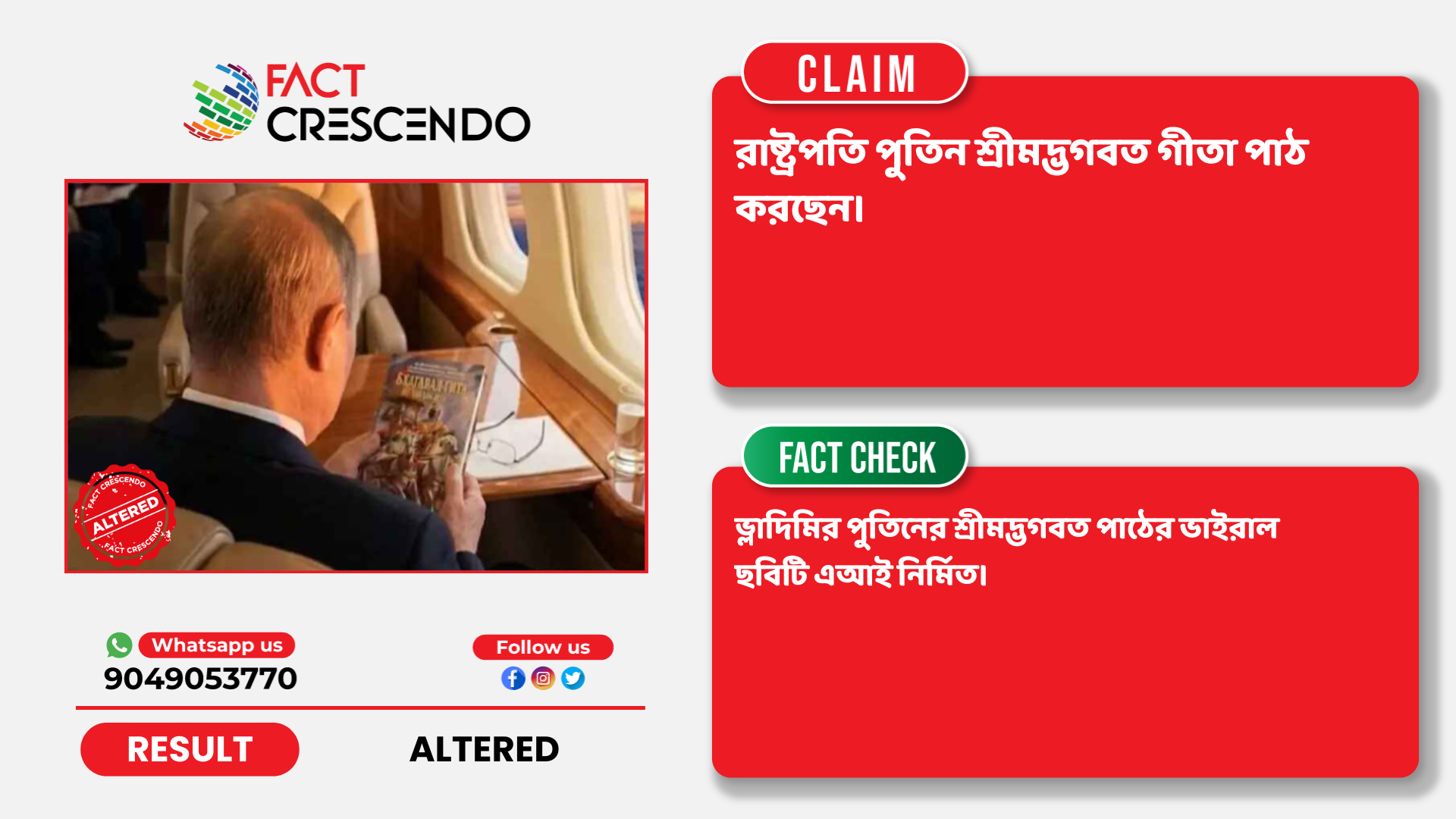 তথ্য যাচাইয়ের মাধ্যমে আমরা জানতে পেরেছি, রুশ প্রেসিডেন্ট ভ্লাদিমির পুতিনের বিমানে বসে ভগবদ গীতা পাঠের যে ছবিটি ভাইরাল হয়েছে, সেটি এআই দ্বারা নির্মিত।