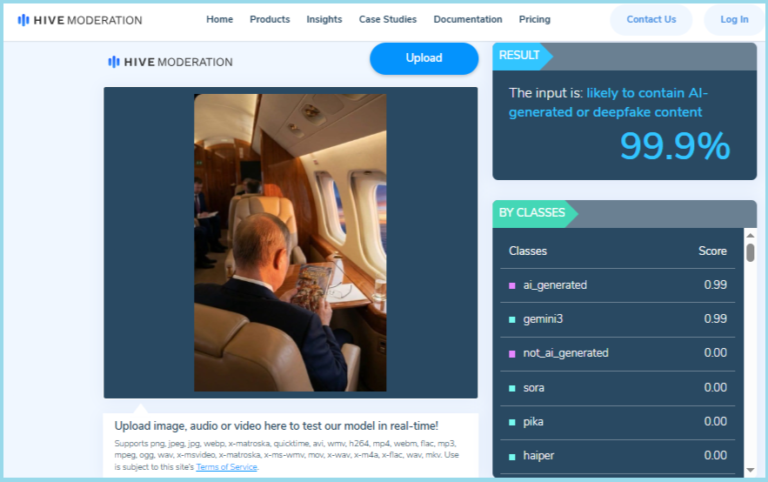 আমরা এআই সনাক্তকরণ ওয়েবসাইট Hive Moderation-এ ছবিটি যাচাই করে দেখি যে এটি এআই দ্বারা তৈরি হওয়ার সম্ভাবনা ৯৯.৯ শতাংশ।