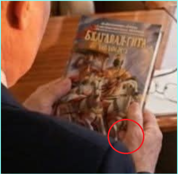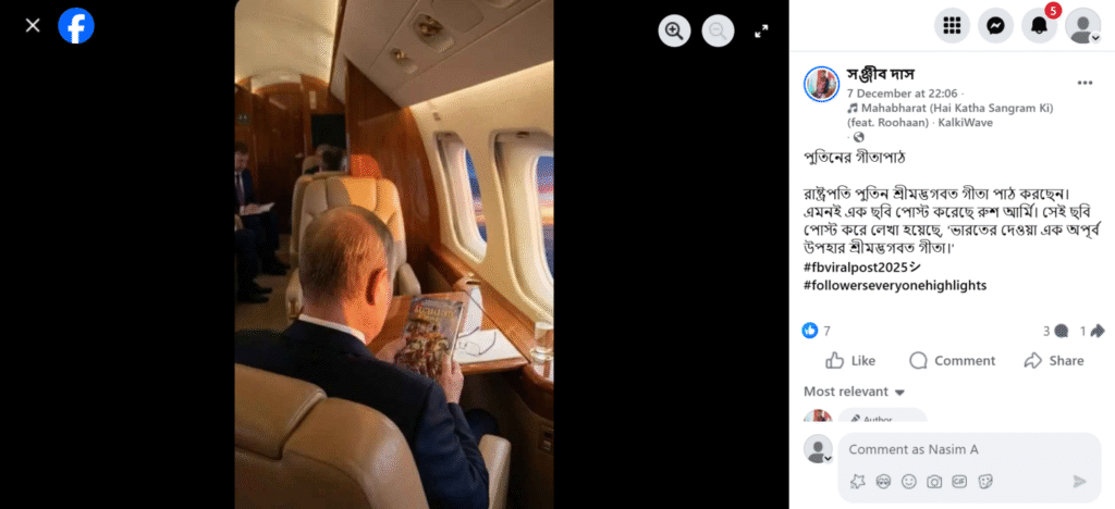 দুই দিনের ভারত সফরে থাকা রাশিয়ার রাষ্ট্রপতি ভ্লাদিমির পুতিনকে প্রধানমন্ত্রী নরেন্দ্র মোদী ভগবদ গীতার রুশ অনুবাদের একটি কপি উপহার দেন। এই প্রসঙ্গে সামাজিক মাধ্যম ফেসবুকে একটি ছবি বিশাল ভাইরাল হচ্ছে যেখানে রুশ রাষ্ট্রপতি ভ্লাদিমির পুতিনকে বিমানে বসে ভগবদ গীতা হাতে দেখা যাচ্ছে। যা শেয়ার করে দাবি করা হচ্ছে যে, রাষ্ট্রপতি পুতিন শ্রীমদ্ভগবত গীতা পাঠ করছেন।