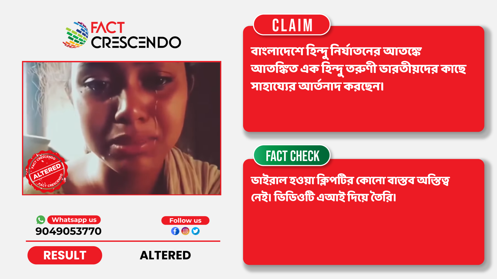নিষ্কর্ষঃ তথ্য যাচাইয়ের মাধ্যমে ফ্যাক্ট ক্রিসেণ্ডো এই সিদ্ধান্তে উপনীত হয়েছে যে, বাংলাদেশের এক হিন্দু তরুণীর কান্নার ভিডিও বলে ভাইরাল হওয়া ক্লিপটির কোনো বাস্তব অস্তিত্ব নেই। ভিডিওটি এআই দিয়ে তৈরি।