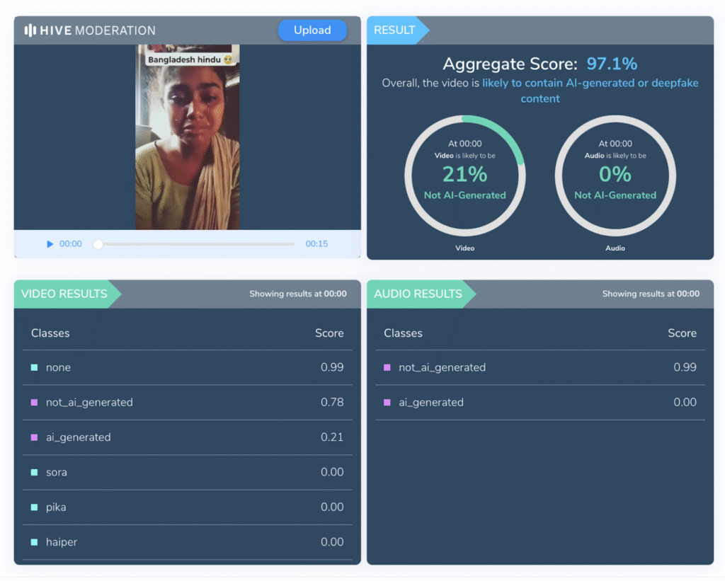 এআই কন্টেন্ট শনাক্তকরণ টুল হাইভ মডারেশন-এ ভিডিওটি টিকে যাচাই করি। যা নিশ্চিত করে ভিডিওটি এআই নির্মিত।