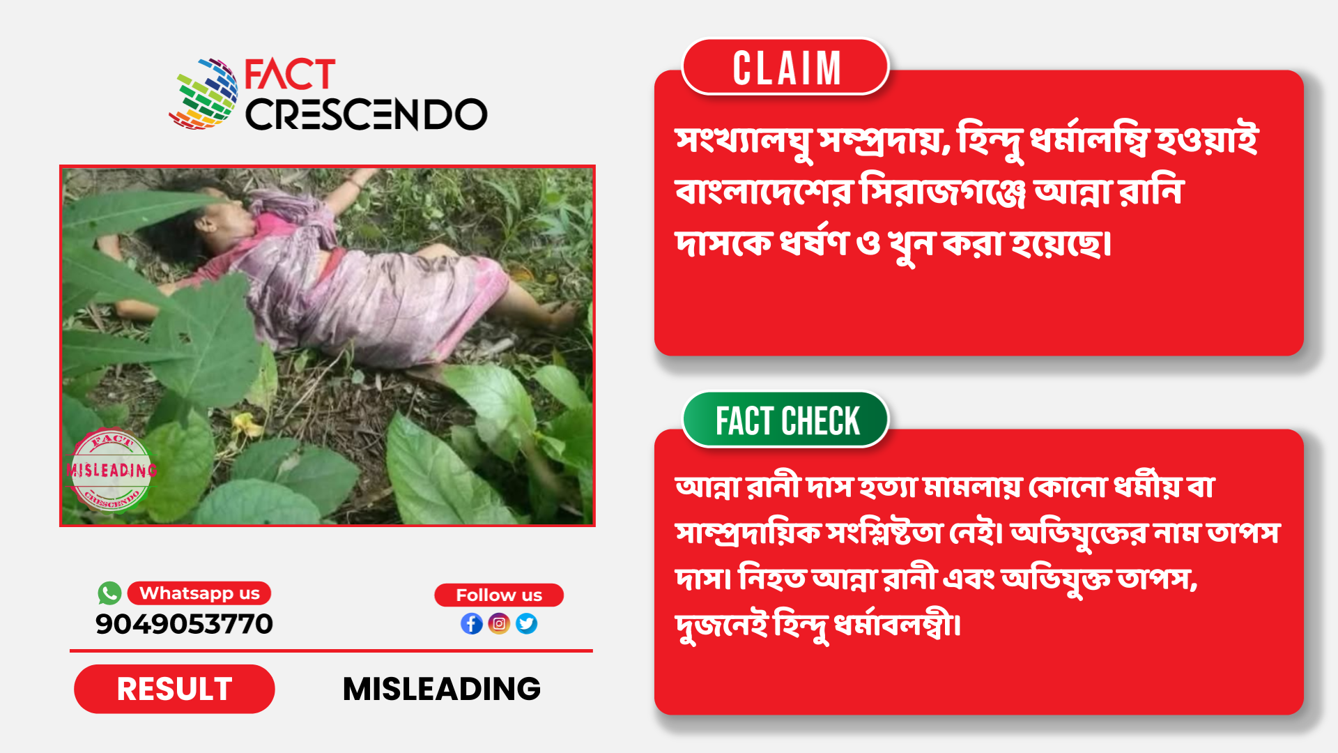 নিষ্কর্ষঃ তথ্য যাচাইয়ের মাধ্যমে ফ্যাক্ট ক্রিসেণ্ডো এই সিদ্ধান্তে উপনীত হয়েছে যে, আন্না রানী দাস হত্যা মামলায় কোনো ধর্মীয় বা সাম্প্রদায়িক সংশ্লিষ্টতা নেই। অভিযুক্তের নাম তাপস দাস। নিহত আন্না রানী এবং অভিযুক্ত তাপস, দুজনেই হিন্দু ধর্মাবলম্বী।