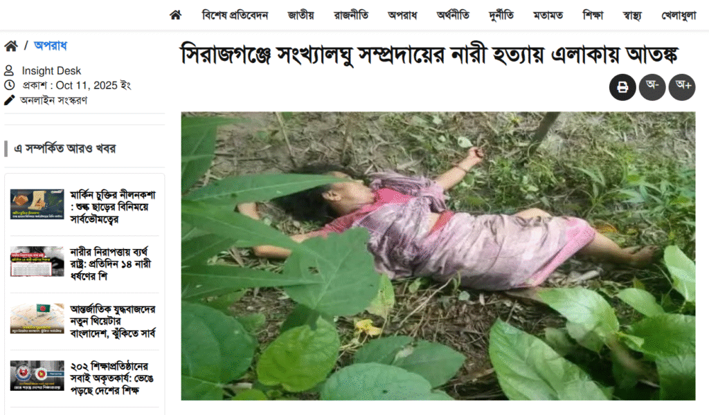 এই দাবির সত্যতা যাচাই করতে আমরা গুগলে প্রাসঙ্গিক কি ওয়ার্ড সার্চ করি। ফলস্বরুপ, ‘bangladeshinsights’-এর প্রতিবেদন অনুযায়ী, মৃত মহিলার নাম আন্না বালা দাস। স্বামী, বিজেন্দ্র চন্দ্র দাস। সিরাজগঞ্জের সলঙ্গা ইসলামি উচ্চ বিদ্যালয়ের পাশের একটি পুকুর পাড়ে তার লাশ পড়ে থাকতে দেখে পুলিশকে খবর করে স্থানীয়রা।