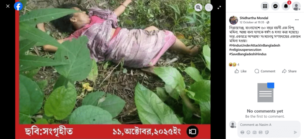 পোস্টের ক্যাপশনে লেখা হয়েছে,”সম্প্রপ্তি এক মহিলার মৃত দেহের ছবি শেয়ার করে দাবি করা হচ্ছে, বাংসিরাজগঞ্জ, বাংলাদেশে ৬০ বছর বয়সী এক হিন্দু মহিলা, আন্না বালা দাসকে ধর্ষণ ও হত্যা করা হয়েছে। তার একমাত্র অপরাধ? সংখ্যালঘু সম্প্রদায়ের একজন মহিলা হওয়া। #HindusUnderAttackInBangladesh #religiouspersecution #SaveBangladeshiHindusলাদেশের সিরাজগঞ্জের বাসিন্দা এই মহিলার নাম আন্না বালা দাস। হিন্দু ধর্মাবলম্বী হওয়াই তাকে ধর্ষণ করে হত্যা করা হয়েছে।“
