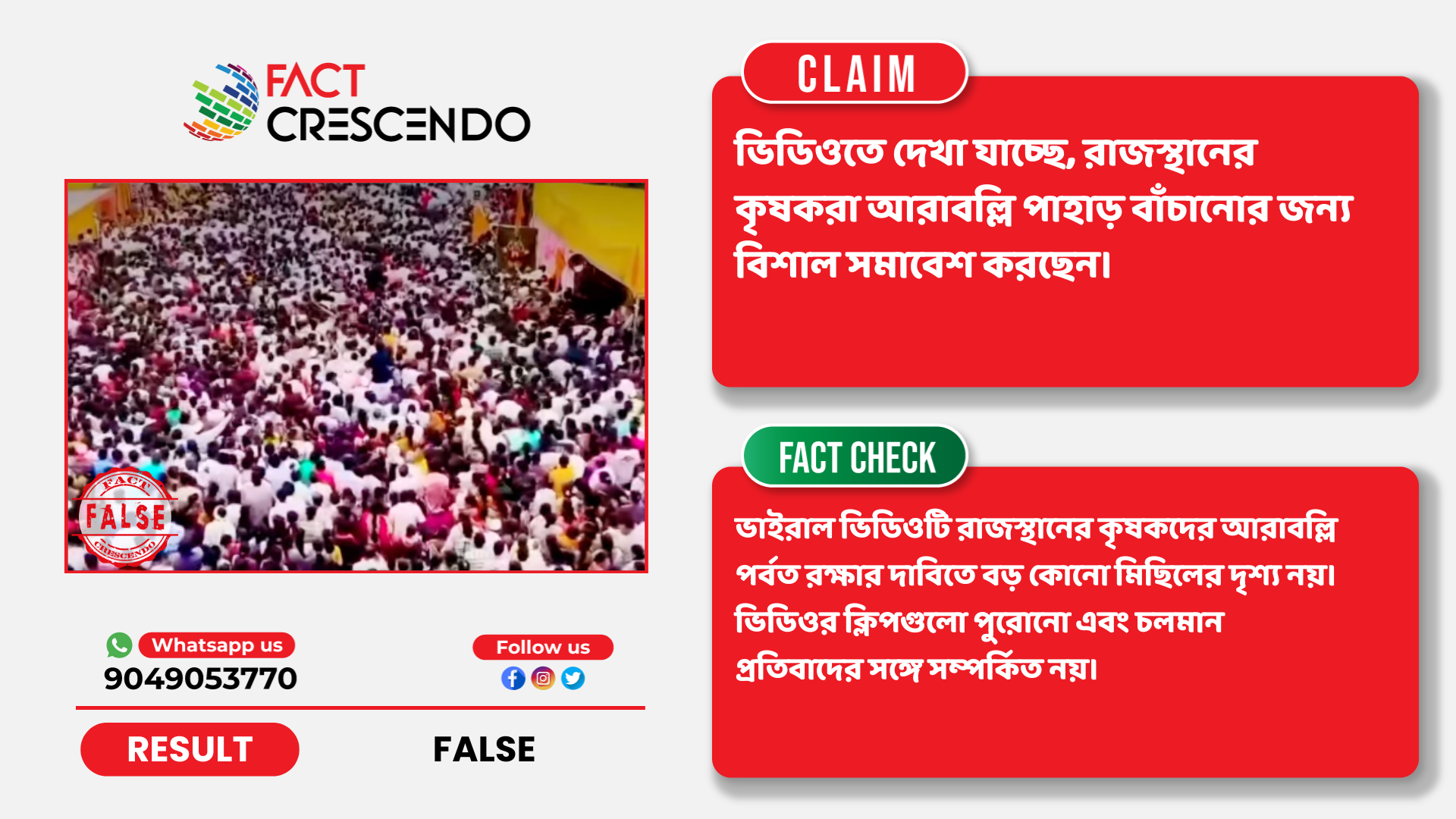 নিষ্কর্ষঃ তথ্য যাচাইয়ের মাধ্যমে ফ্যাক্ট ক্রিসেণ্ডো এই সিদ্ধান্তে উপনীত হয়েছে যে, ভাইরাল ভিডিও রাজস্থানের কৃষকদের আরাবল্লি পর্বত রক্ষার দাবিতে বড় কোনো মিছিলের দৃশ্য নয়। ভিডিওর ক্লিপগুলো পুরোনো এবং চলমান প্রতিবাদের সঙ্গে সম্পর্কিত নয়।