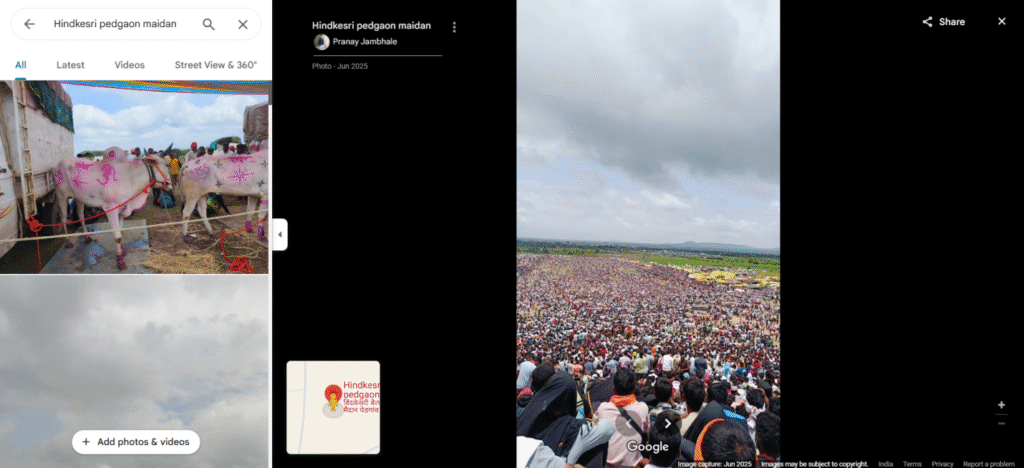 আরও স্পষ্টতা আনতে, আমরা ভাইরাল ভিডিওটির সঠিক অবস্থান নির্ধারণের জন্য Google Maps-এর সাহায্যে জিও-লোকেশন বিশ্লেষণ করেছি। ভিডিওতে একটি বিশেষ ধরনের পাহাড় বা উঁচু টিলা স্পষ্টভাবে দৃশ্যমান ছিল। আমরা সেটি গুগল ম্যাপসে ২০২৫ সালের জুন মাসে ‘হিন্দকেশরী পেডগাঁও ময়দান’, মহারাষ্ট্র থেকে আপলোড হওয়া একটি ছবির সঙ্গে মিলিয়ে দেখি। উভয় ছবিতে একই ধরনের প্রাকৃতিক দৃশ্যপট ও পাহাড়ের অবস্থান মিলে যাওয়ায় নিশ্চিত হওয়া যায় যে ভিডিওটি বিহারের নয়, বরং মহারাষ্ট্রের সাতারা জেলার পেডগাঁও-এ ধারণ করা হয়েছে।
