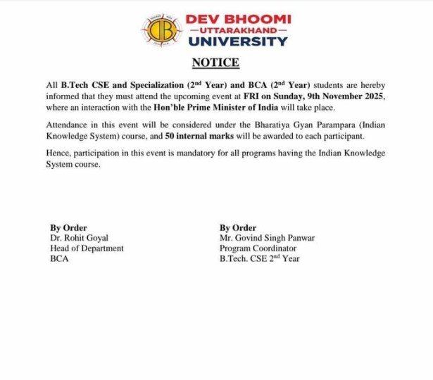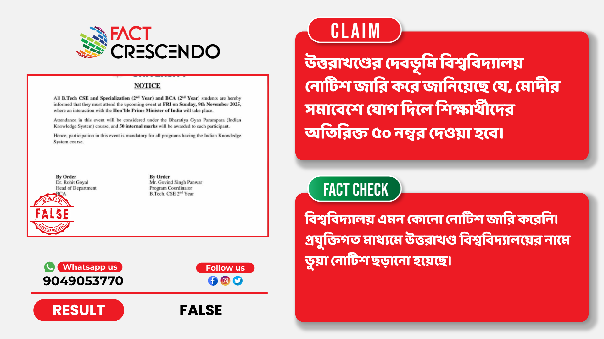 সম্প্রতি ফেসবুকে উত্তরাখণ্ডের নামী শিক্ষা প্রতিষ্ঠান দেবভূমি বিশ্ববিদ্যালয়-এর নামে একটি নোটিশ ব্যাপকভাবে ভাইরাল হচ্ছে। ওই নোটিশটি শেয়ার করে দাবি করা হচ্ছে যে, বিশ্ববিদ্যালয়ের পক্ষ থেকে জানানো হয়েছে, প্রধানমন্ত্রী নরেন্দ্র মোদির সমাবেশে যোগ দিলে শিক্ষার্থীদের ৫০ নম্বর দেওয়া হবে। ভাইরাল হওয়া নোটিশে লেখা রয়েছে,“সমস্ত B.Tech CSE ও স্পেশালাইজেশন (২য় বর্ষ) এবং BCA (২য় বর্ষ)-এর ছাত্রছাত্রীদের জানানো যাচ্ছে যে তারা অবশ্যই ৯ই নভেম্বর ২০২৫, রবিবার শুক্রবারতে অনুষ্ঠিত হতে যাওয়া আসন্ন অনুষ্ঠানে উপস্থিত থাকবে, যেখানে ভারতের মাননীয় প্রধানমন্ত্রী শিক্ষার্থীদের সঙ্গে এক আলাপচারিতায় অংশ নেবেন। এই অনুষ্ঠানে উপস্থিতি ভারতীয় জ্ঞান পরম্পরা (Indian Knowledge System) কোর্সের অংশ হিসেবে বিবেচিত হবে এবং প্রতিটি অংশগ্রহণকারীকে ৫০টি অভ্যন্তরীণ নম্বর দেওয়া হবে। তাই যেসব প্রোগ্রামে Indian Knowledge System কোর্স রয়েছে, তাদের সকল শিক্ষার্থীর জন্য এই ইভেন্টে অংশগ্রহণ বাধ্যতামূলক।“