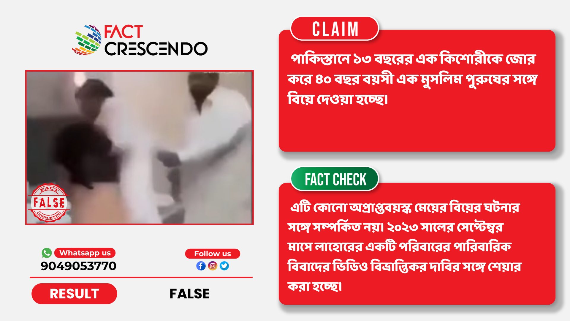 তথ্য যাচাইয়ের মাধ্যমে আমরা পেয়েছ ভিডিওটি পাকিস্তানের লাহোরের ঘটনা এবং এতে পারিবারিক সহিংসতার একটি দৃশ্য দেখা যায়। এটি কোনো অপ্রাপ্তবয়স্ক মেয়ের বিয়ের ঘটনার সঙ্গে সম্পর্কিত নয়।