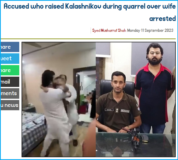 পাকিস্তানি সংবাদ মাধ্যম এক্সপ্রেস-এর প্রতিবেদন অনুযায়ী, লাহোরে খুররম শাব্বির নামের এক ব্যক্তি ঝগড়ার পর তার স্ত্রীকে হত্যার উদ্দেশ্যে বন্দুক তুলে নিয়েছিল। পরিবারের অন্য সদস্যরা তাকে বাধা দিয়ে স্ত্রীকে রক্ষা করেছিল। পরে ওই নারী তার স্বামীর বিরুদ্ধে অভিযোগ দায়ের করলে পুলিশ লাহোরের সাউথ ক্যান্টনমেন্ট এলাকা থেকে তাকে গ্রেপ্তার করা হয়েছিল।