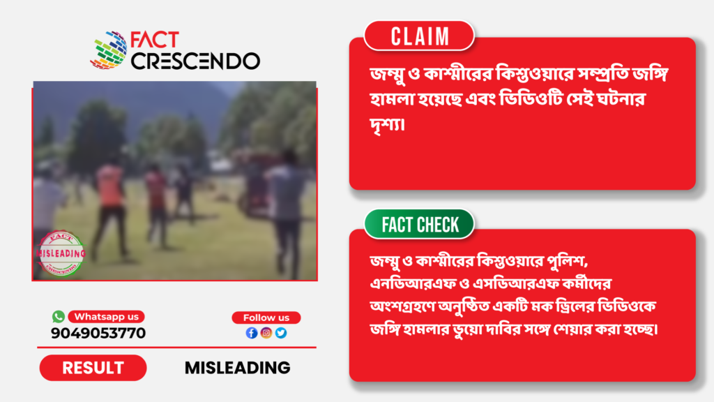 নিষ্কর্ষঃ তথ্য যাচাইয়ের মাধ্যমে ফ্যাক্ট ক্রিসেণ্ডো এই সিদ্ধান্তে উপনীত হয়েছে যে, জম্মু ও কাশ্মীরের কিশ্তওয়ারে পুলিশ, এনডিআরএফ ও এসডিআরএফ কর্মীদের অংশগ্রহণে অনুষ্ঠিত একটি মক ড্রিলের ভিডিওকে জঙ্গি হামলার ভুয়ো দাবির সঙ্গে শেয়ার করা হচ্ছে।