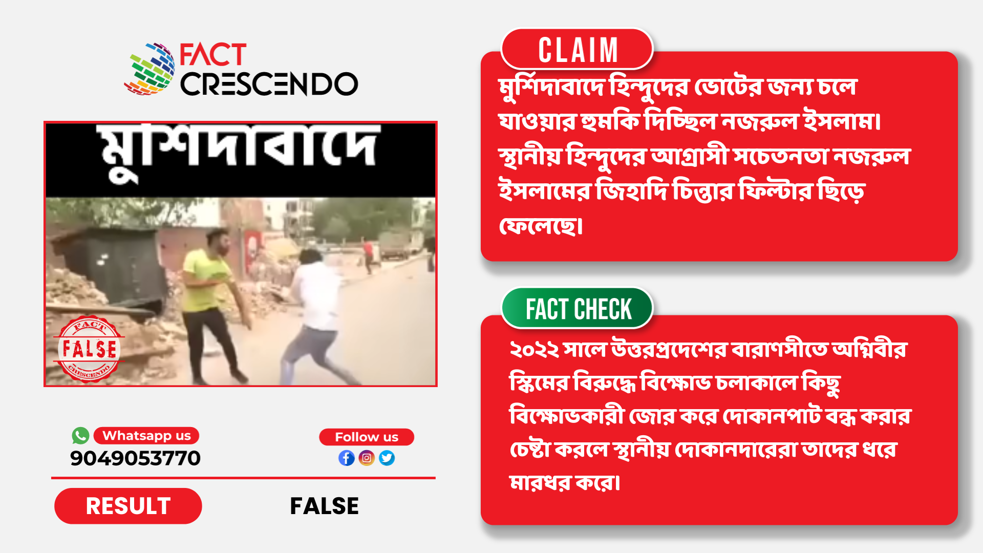 তথ্য যাচাই করে দেখা গেছে, ভাইরাল দাবিটি মিথ্যা। ২০২২ সালে উত্তরপ্রদেশের বারাণসীতে অগ্নিবীর স্কিমের বিরুদ্ধে বিক্ষোভ চলাকালে কিছু বিক্ষোভকারী জোর করে দোকানপাট বন্ধ করার চেষ্টা করলে স্থানীয় দোকানদারেরা তাদের ধরে মারধর করে।