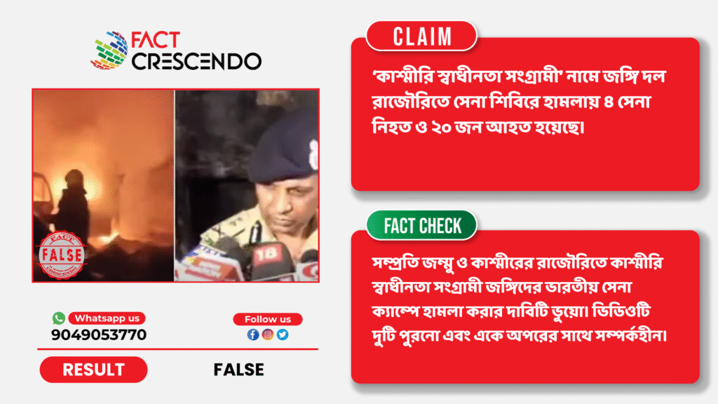 সামাজিক মাধ্যম ফেসবুকে দুটি ভিডিওর কোলাজ একটি ভিডিও ভাইরাল হচ্ছে যেখানে দাবি করা হচ্ছে যে ‘কাশ্মীরি স্বাধীনতা সংগ্রামী’ নামে একটি জঙ্গি সংগঠন জম্মু ও কাশ্মীরের রাজৌরিতে একটি ভারতীয় সেনা শিবিরে হামলা চালিয়ে চারজন জওয়ানকে হত্যা করেছে এবং আরও ২০ জনের বেশি গুরুতর আহত হয়েছে। প্রথম ভিডিওতে একটি ভবনে ভয়াবহ বিস্ফোরণের দৃশ্য দেখা যায়, যেখানে পুরো ভবনটি আগুনে জ্বলছে। দ্বিতীয় ভিডিওতে একজন জ্যেষ্ঠ পুলিশ কর্মকর্তাকে সংবাদমাধ্যমের সামনে চারজনের মৃত্যুর বিষয়টি নিশ্চিত করতে দেখা যায়। দুটি ভিডিও এমনভাবে উপস্থাপন করা হয়েছে যেন এগুলো একই হামলার সঙ্গে সম্পর্কিত।