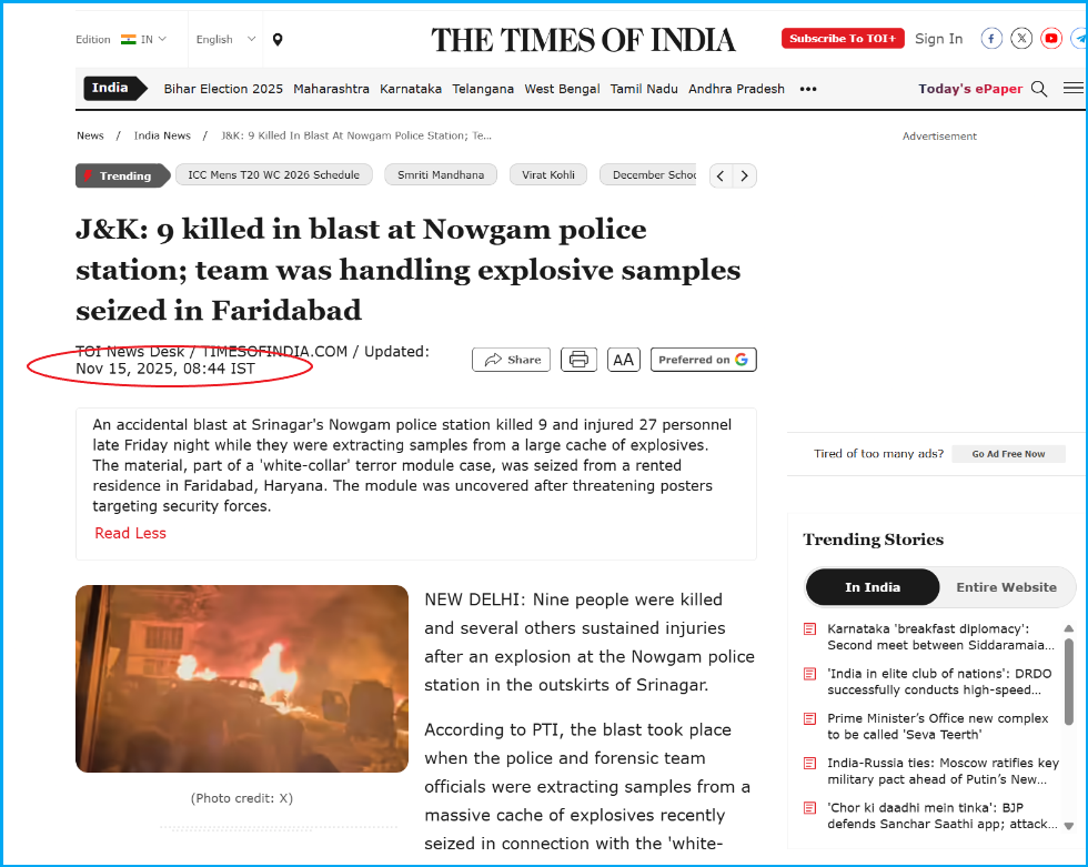 ‘WION’-এর ইউটিউব চ্যানেলে ১৫ নভেম্বর, ২০২৫, তারিখে আপলোড করা ভিডিওর উপস্থাপন অনুযায়ী, জম্মু ও কাশ্মীরের শ্রীনগরের নওগাম থানায় ভয়াবহ বিস্ফোরণে অন্তত নয়জন নিহত ও ২৯ জন আহত হন। থানার প্রাঙ্গণে জব্দ করা বিস্ফোরক পরীক্ষা করার সময় ফরেনসিক দলের উপস্থিতিতেই বিস্ফোরণটি ঘটেছিল।