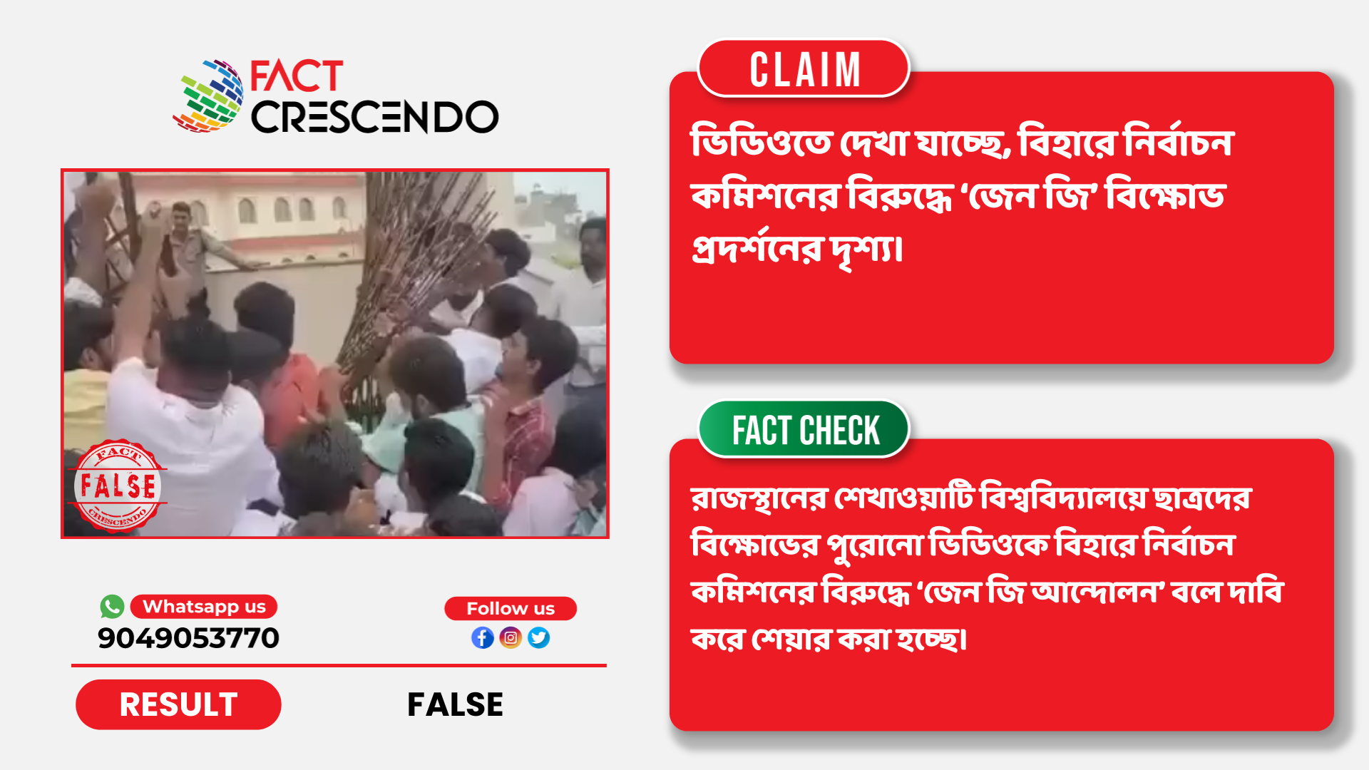 নিষ্কর্ষঃ তথ্য যাচাইয়ের মাধ্যমে ফ্যাক্ট ক্রিসেন্ডো এই সিদ্ধান্তে উপনীত হয়েছে যে, রাজস্থানের শেখাওয়াটি বিশ্ববিদ্যালয়ে ছাত্রদের বিক্ষোভের পুরোনো ভিডিওকে বিহারে নির্বাচন কমিশনের বিরুদ্ধে ‘জেন জি আন্দোলন’ বলে দাবি করে শেয়ার করা হচ্ছে।
