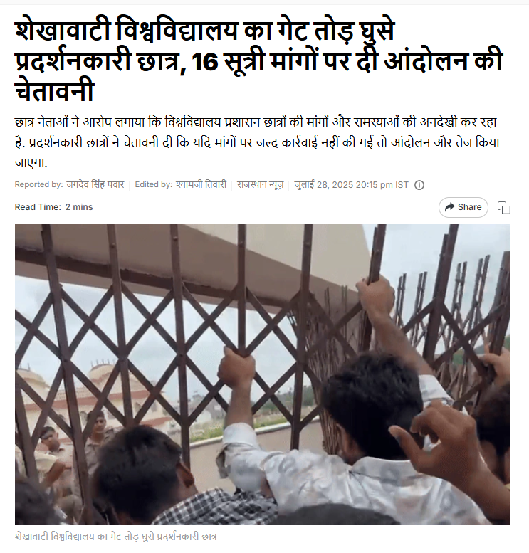 এনডি টিভির প্রতিবেদন অনুযায়ী,“রাজস্থানে ছাত্রসংঘ নির্বাচনের দাবিতে উত্তেজনা শেখাওয়াটি বিশ্ববিদ্যালয়ে এসএফআই–এর বিক্ষোভ রাজস্থানে ছাত্রসংঘ নির্বাচন করানোর দাবি ক্রমেই জোরদার হচ্ছে। সোমবার শেখাওয়াটি বিশ্ববিদ্যালয়ে স্টুডেন্টস ফেডারেশন অফ ইন্ডিয়া (এসএফআই)-এর পতাকার নিচে ছাত্র–ছাত্রীরা তীব্র বিক্ষোভ প্রদর্শন করে। এসএফআই কর্মীরা ছাত্রসংঘ নির্বাচন আয়োজনসহ ১৬ দফা দাবিকে সামনে রেখে বিশ্ববিদ্যালয় চত্বরে র্যালি বের করেন এবং পরে মূল বিশ্ববিদ্যালয় ভবনের উপাচার্যের দফতরে পৌঁছান। বিক্ষোভ চলাকালীন ছাত্রনেতারা স্লোগান দিতে দিতে পুরো ক্যাম্পাস উত্তপ্ত করে তোলেন।“