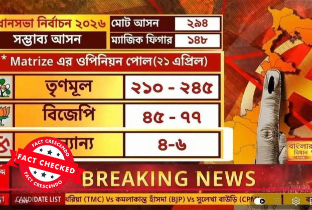 ২৩ এবং ২৯ এপ্রিল দুই দফায় ২০২৬ সালের বিধানসভা নির্বাচনের ভোটগ্রহণ অনুষ্ঠিত হবে। ফল প্রকাশ হবে ৪ মে। ভোটগ্রহণের আগে বিভিন্ন সংবাদমাধ্যম ও স্বতন্ত্র সংস্থা অপিনিয়ন পোল প্রকাশ করে থাকে। সম্প্রতি এমনই একটি ওপিনিয়ন পোলের প্ল্যাকার্ড সামাজিক মাধ্যম ফেসবুকে ব্যাপকভাবে ভাইরাল হয়েছে। ম্যাট্রিজ-এর এই পোল অনুযায়ী, তৃণমূল কংগ্রেস ২১০–২৪৫টি আসন এবং বিজেপি ৪৫–৭৭টি আসনে জয়লাভ […]
