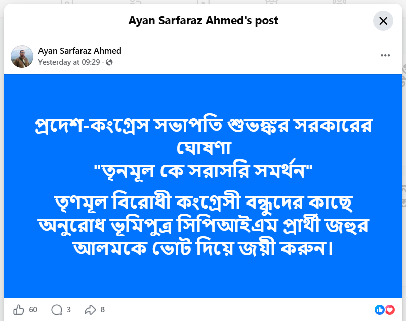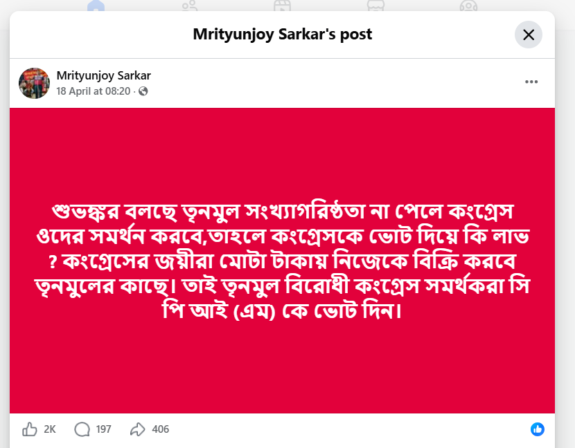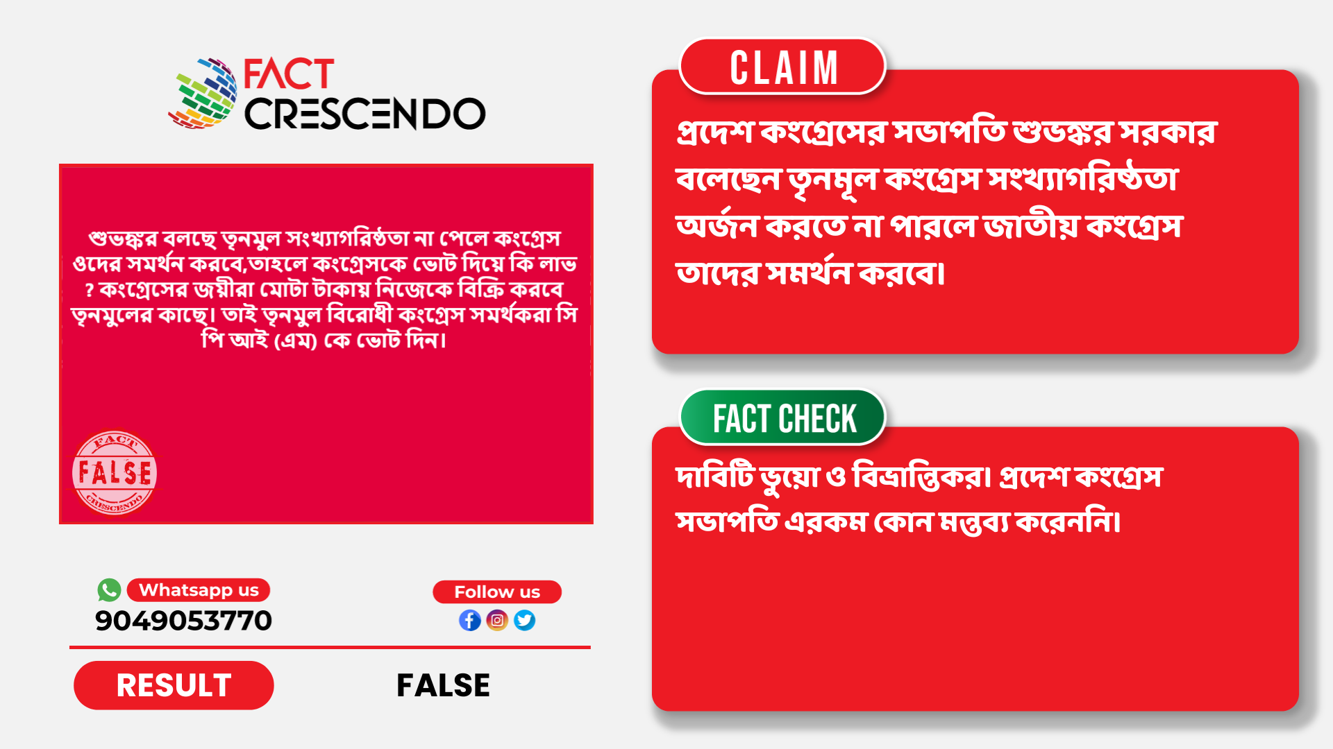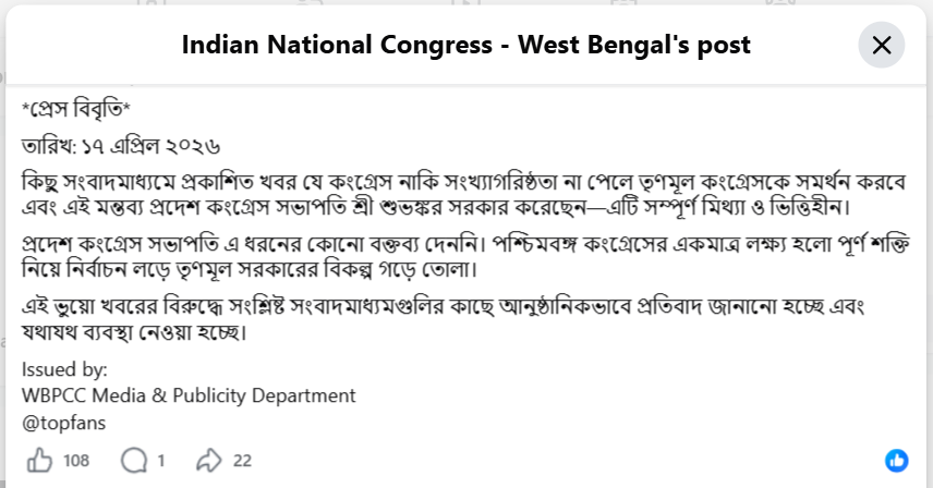আসন্ন বিধানসভা নির্বাচনকে কেন্দ্র করে রাজনৈতিক দলগুলো জোরকদমে প্রচার শুরু করেছে তৃনমূল কংগ্রেস ঘোষণা করেছে যে তারা এই নির্বাচনে কোনো জোটে অংশ নেবে না এবং ২৯৪টি আসনে একাই লড়বে। এই নির্বাচনী প্রেক্ষাপটে একটি পোস্ট ব্যাপকভাবে ভাইরাল হয়েছে, যেখানে দাবি করা হচ্ছে যে প্রদেশ কংগ্রেসের সভাপতি শুভঙ্কর সরকার বলেছেন তৃনমূল কংগ্রেস সংখ্যাগরিষ্ঠতা অর্জন করতে না পারলে কংগ্রেস তাদের সমর্থন করবে।