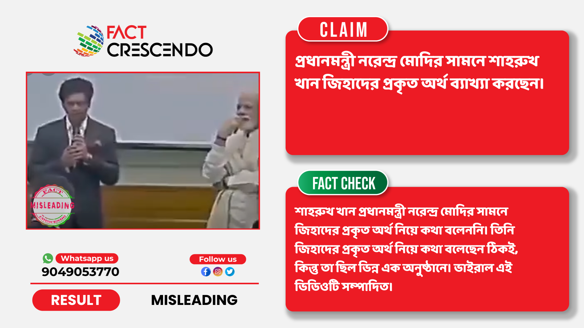 সম্প্রতি যোগাযোগ মাধ্যম ফেসবুকে শাহরুখ খান ও প্রধানমন্ত্রী নরেন্দ্র মোদীর একটি ভিডিও খুব ভাইরাল হচ্ছে যেখানে শাহরুখ খান ইসলামিক দৃষ্টিকোনে জিহাদের আসল মানে বলছেন। ভিডিওটি শেয়ার করে ক্যাপশনে লেখা হয়েছে,”পৃথিবীর সবথেকে ধোনি ও বলিউডের বিখ্যাত সুপারস্টার শাহরুখ খান pm মোদীর সামনে জিহাদ শব্দের অর্থ বুঝিয়ে দিচ্ছে। 2014 বিজেপি ক্ষমতায় আসার পর থেকে মিডিয়া ও হিন্দুত্ববাদী আইটি সেল জিহাদ শব্দকে কে অপব্যবহার করে যা খুশি ক্রাইমের সাথে জিহাদ শব্দ লাগিয়ে দিচ্ছে ইসলাম ধর্ম কে ছোটো করার জন্য ।। pm মোদি নিজেও নির্বাচন প্রচার করার সময় ভোট জিহাদ, লাভ জিহাদ শব্দ গুলো ব্যবহার করেছে, সেই মোদির সামনে দাঁড়িয়ে জিহাদ শব্দটার অর্থ বুঝিয়ে দিলো সুপারস্টার শাহরুখ খান নরেন্দ্র মোদী ও তার ভক্তদের মুখের ওপর।।“