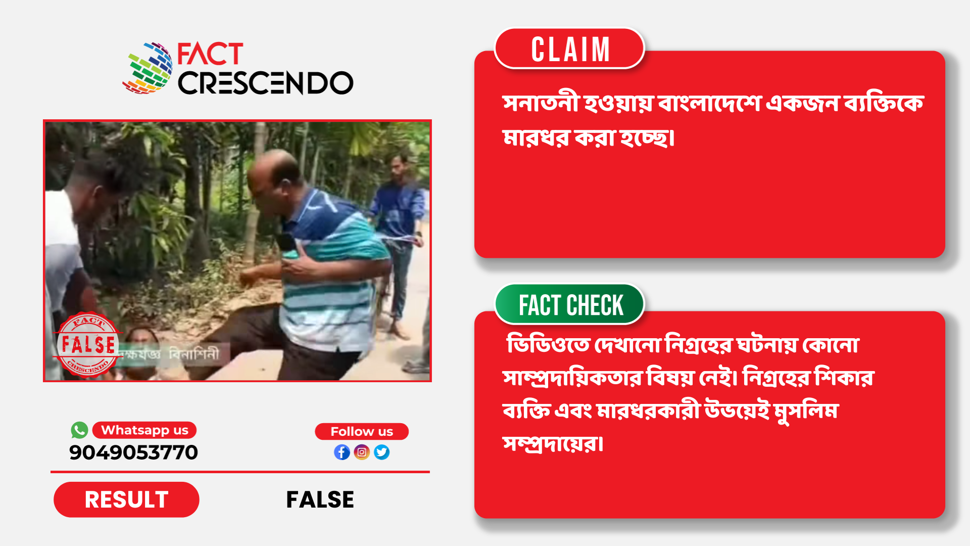 নিষ্কর্ষঃ  তথ্য যাচাইয়ের মাধ্যমে ফ্যাক্ট ক্রিসেণ্ডো এই সিদ্ধান্তে উপনীত হয়েছে যে, বাংলাদেশে হিন্দু হওয়ার কারণে মারধর করা হচ্ছে এমন দাবিতে ভাইরাল হওয়া ভিডিওটি মিথ্যা। ভিডিওতে দেখানো নিগ্রহের ঘটনায় কোনো সাম্প্রদায়িকতার বিষয় নেই। নিগ্রহের শিকার ব্যক্তি এবং মারধরকারী উভয়েই মুসলিম সম্প্রদায়ের।