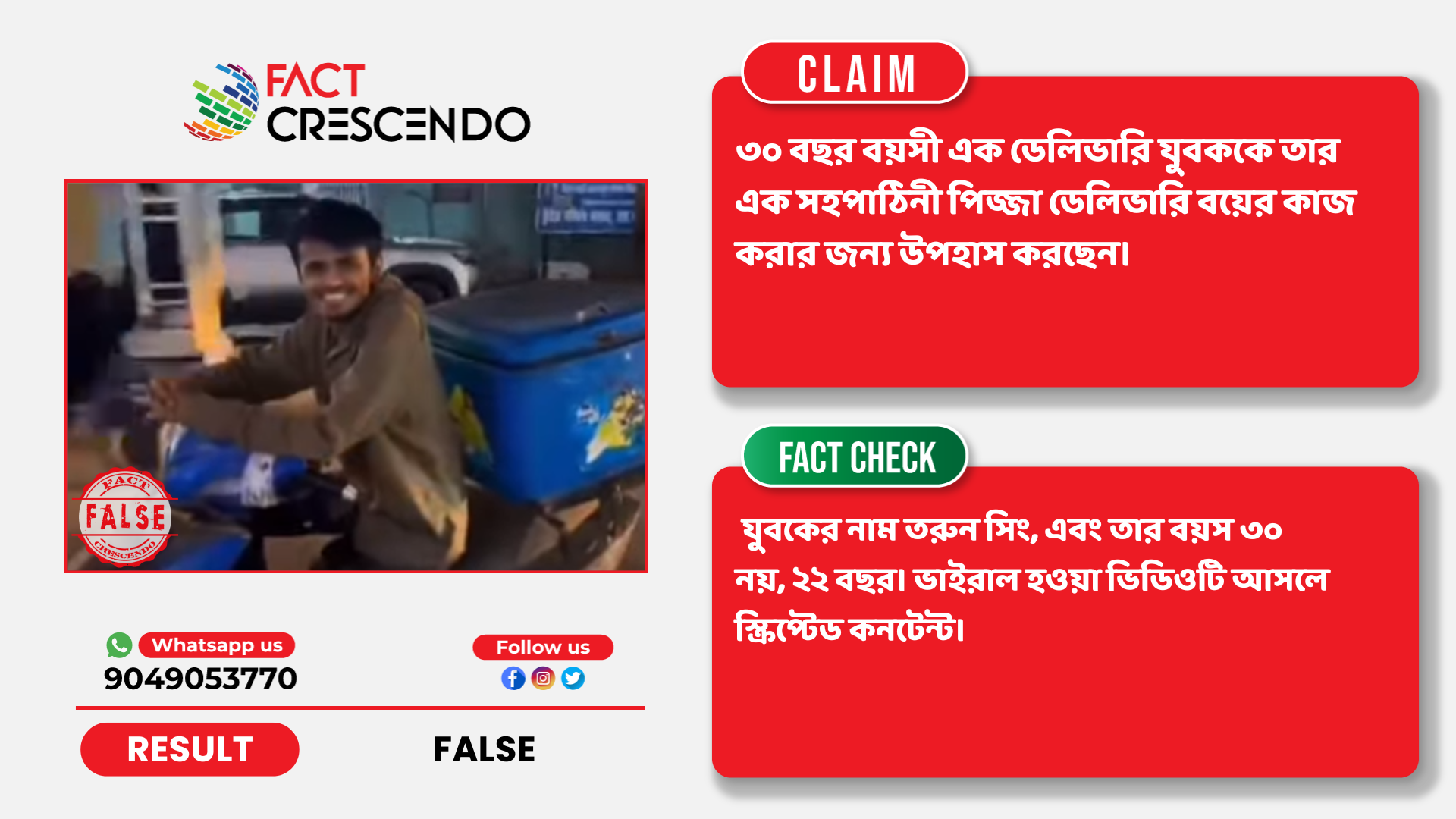 ডেলিভারি বয়-এর রোলে অভিনয় করা এই যুবকের নাম তরুন সিং। বিভ্রান্তিকর দাবির সাথে ভিডিওটি ভাইরাল হওয়ার পর তরুনও একটি ভিডিও পোস্ট করে স্পষ্ট করেছেন এটি শুধুমাত্র বিনোদনের উদ্দেশ্যে বানানো।