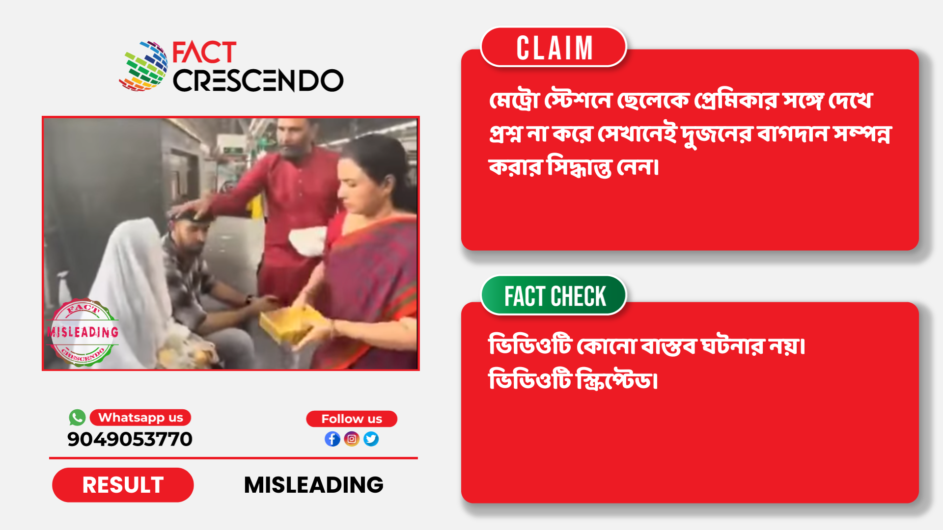 নিষ্কর্ষঃ তথ্য যাচাইয়ের মাধ্যমে ফ্যাক্ট ক্রিসেণ্ডো এই সিদ্ধান্তে উপনীত হয়েছে যে, মেট্রো স্টেশনে বাগদান অনুষ্ঠানের ভাইরাল ভিডিওটি স্ক্রিপ্টেড।