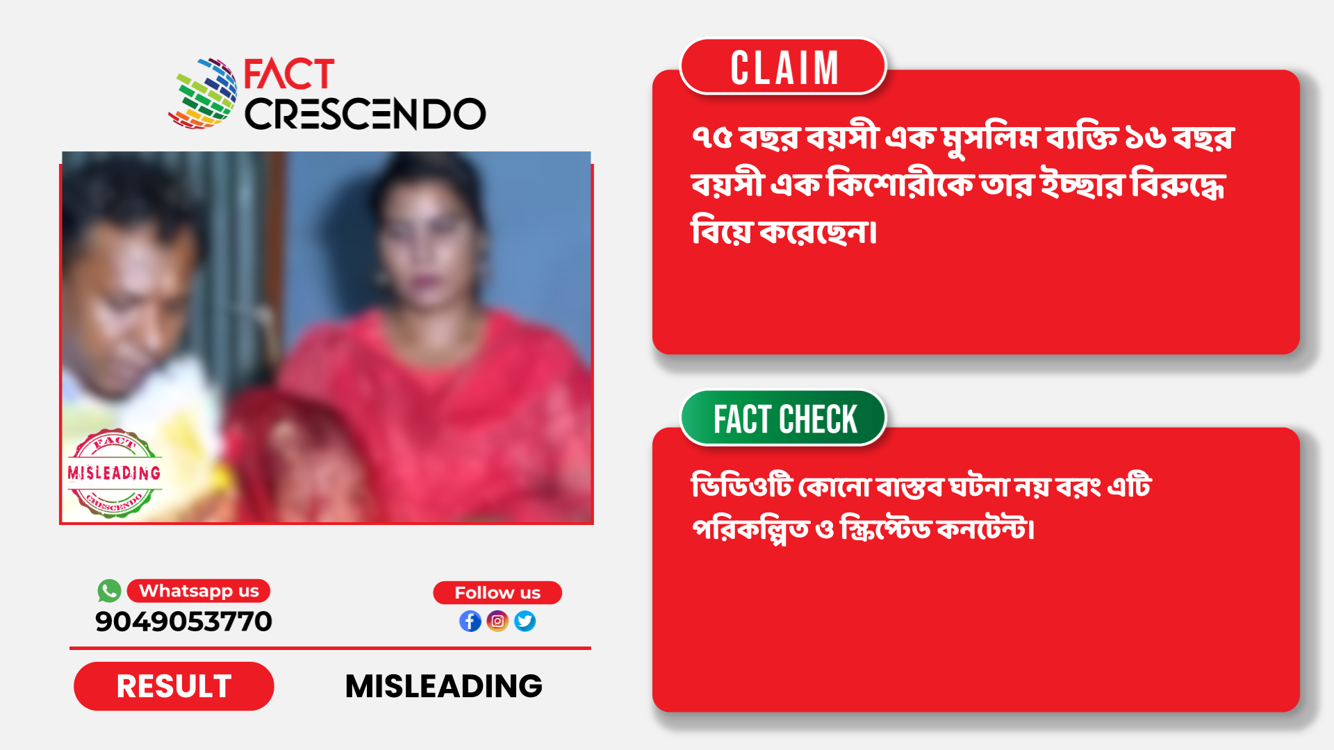 নিষ্কর্ষঃ তথ্য যাচাইয়ের মাধ্যমে ফ্যাক্ট ক্রিসেণ্ডো এই সিদ্ধান্তে উপনিত হয়েছে যে, প্রাপ্তবয়স্ক দ্বারা তরুণীকে জোরপূর্বক বিয়ে করার ভিডিওটি কোনো বাস্তব ঘটনা নয় বরং এটি পরিকল্পিত ও স্ক্রিপ্টেড কনটেন্ট।
