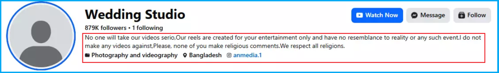 পেজটির বিবরণীতে লেখা হয়েছে- আমাদের ভিডিওগুলোকে কেউ সিরিয়াসভাবে নেবেন না। আমাদের রিলস শুধুমাত্র আপনাদের বিনোদনের জন্য তৈরি, বাস্তবতা বা কোনো প্রকৃত ঘটনার সঙ্গে এর কোনো মিল নেই। আমরা কারও বিরুদ্ধে কোনো ভিডিও তৈরি করি না। অনুগ্রহ করে কেউ ধর্মীয় মন্তব্য করবেন না। আমরা সব ধর্মকে সম্মান করি।